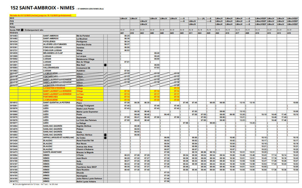 =>le départ de 6H40 à l'arrêt “Sinsans” pour Nîmes sera avancé de 5 minutes soit un passage à 6h35, à 6h48 à l'arrêt “Collège le Vignet“, 6h50 à l'arrêt ”République" et 6h53 à l'arrêt "Route de "Nîmes" .