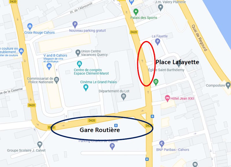 L'Arrêt Cahors - Place De Gaulle [Gare Routière] est déplacé à l'Arrêt Cahors - Place Lafayette (à proximité de l'église Saint-Barthélemy).